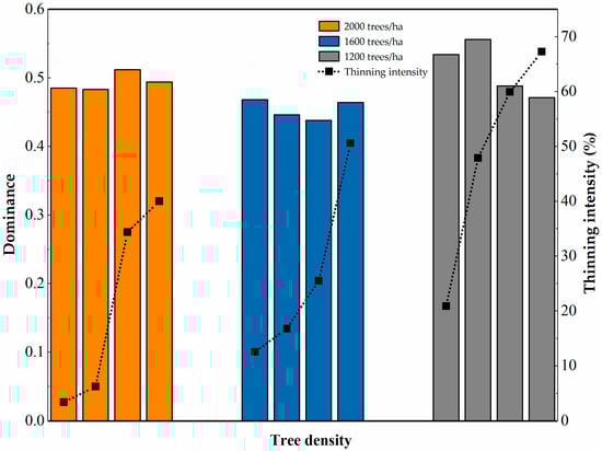 No significant differences were found for the dominance in any of the plots after thinning (Table 4). Dominance values ranged from (0.438, 0.556) and the proportion of overall dominant trees was moderate. At the same time, there was no significant difference in the frequency distribution under the five values. Except for plots 6 and 10, the average U of all plots was lower than that of the unthinned plot. Average dominance decreased with the decrease in tree density in low thinning intensity plots. In the case of the medium and high thinning intensity plots, average U first increased and then decreased as the tree density increased with minimum values occurring in plots 5 (1650 trees/ha) and 11 (1500 trees/ha), which indicates that the number of reserved trees had an impact on dominance. At high thinning intensities, the trend first decreased and then increased with the minimum value occurring in plot 9 (1950 trees/ha). When the tree density was about 2000 trees/ha and 1200 trees/ha, the value first increased and then decreased with increasing thinning intensity and the trend was opposite to the change of value when the density was approximately 1600 trees/ha (Figure 3).