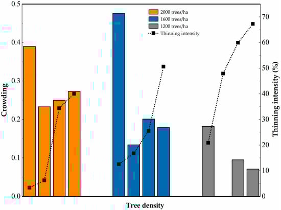 Crowding differed significantly across plots (Table 6). The average C in plot 10 was zero and exhibited extremely sparse characteristics while the remaining plots exhibited extremely sparse to moderately dense conditions ranging between (0.071, 0.476). This indicates that the competitive pressure of reference trees within the study forest was low. Most values were distributed between the extremely sparse and sparse categories (C = 0, 0.25) while the distribution of trees in the other crowding categories was minimal. Significant differences were found between plots 2, 3, 10, 13, and the unthinned plot. When the thinning intensity was low, average C varied between plot 3 and the others and when tree density decreased, average C first decreased and then increased. Plot 4 exhibited moderate crowding with a value close to 0.5. No significant differences in C were identified in the medium and extra-high thinning intensity plots. However, as the tree density decreased, the average C gradually increased in plots where medium thinning intensity was applied in direct contrast to plots where extremely high thinning intensity was applied. In the high thinning intensity plots, they varied between plot 10 and the others. It had the same trend when the tree density was about 1600 trees/ha and 1200 trees/ha (Figure 5).
