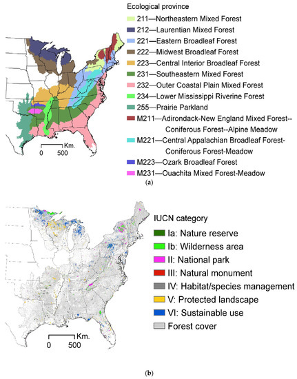 (a) Ecological provinces and study area; (b) IUCN protected areas and forest cover.