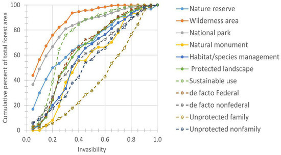To further assess invasibility differences among protection categories, we compared the cumulative invasibility, i.e., the cumulative percentage of forest area with invasibility less than a threshold value, among protection categories. This allowed us to evaluate differences in per-unit area exposures among protected categories for different invasibility thresholds. This perspective is useful for addressing conservation goals which are stated in terms of maintaining a minimum level of (rather than absence of) threat from invasive species [40,41]. In addition, since total forest area varies substantially among protection categories, we also compared the estimated proportion of total forest area that was invaded, i.e., total invaded forest area divided by the total forest area.