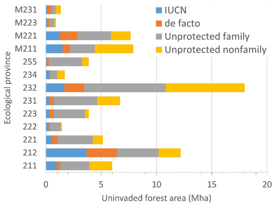 The opportunities for conferring IUCN protection upon uninvaded forest with de facto or no protection varied substantially among ecological provinces (Figure 3). The estimated de facto share of uninvaded forest was larger than the IUCN protected share in seven of the 13 provinces (223, 231, 232, 255, M221, M223, and M231) but was smaller than the unprotected share in all provinces. In all provinces except 234, M211, and M231, the largest share of uninvaded forest was unprotected family forest. The unprotected nonfamily category contained the second-largest share in all provinces except 212, 222, 223, and M223.