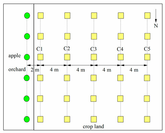The area of the apple orchard in Changwu increases year by year, and the apple industries has become one of the pillar industry in the region’s economic development. One apple orchard and one cropland are selected as the object in this study in 2014. The variety of apple and crop is red Fuji and Xianyu 335, respectively. Figure 2 shows the layout of the soil moisture monitoring sites. The direction of transects is north-south. The sampling sites are distributed from east to west, as apple orchard, C1, C2, C3, C4, and C5, respectively. There are six replicates at each sampling site and the neutron probes are distributed from north to south. C1, C2, C3, C4, and C5 are the sampling sites in the cropland of 2, 6, 10, 14, and 18 m from the site in the apple orchard. In addition, there was no other vegetation at the site and we have applied regular pest control and weeding at an appropriate time in this agroforestry system.