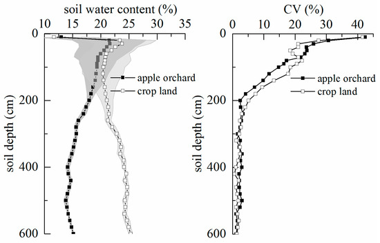 Figure 3 shows the vertical distribution and the variations of soil moisture in the apple orchard and cropland. In general, the characteristics of the variations are similar in profile for the two land use types. The soil moisture changes dramatically and the coefficient of variation (CV) of SWC in the surface layer (0–200 cm) is large. The CVs of the soil moisture in the cropland and the apple orchard are about 5.1% and 2.5%, respectively. The CV of soil moisture gradually decreases and becomes stable with an increasing soil depth. The SWCs of the cropland and the apple orchard are significantly different, with that of the cropland being significantly higher than that of the apple orchard (p < 0.01). Under 120 cm depth of soil layer, the SWC increases with the highest value being 25.3%. The lowest value recorded was 13.8%.
