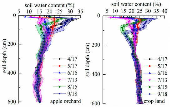 (1) The SWCs of the cropland and the apple orchard are significantly affected by precipitation. The SWC of each soil layer in the cropland (0–20, 20–60, 60–100, 100–200, 200–300 cm) is higher than that of the orchard (p < 0.05), and it is most apparent in the 200–300 cm soil layer. The soil moisture changes dramatically in the 0–200 cm soil layer. These differences are due to the different physiological water demand of the different vegetation growing on different land use types.
