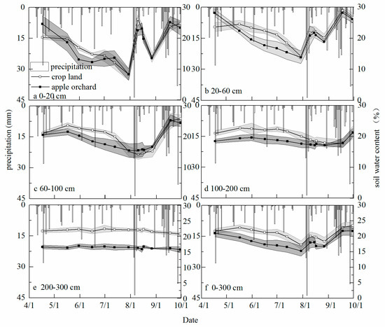 Precipitation is the only source of soil moisture in this area, so it clearly influences the SWC. The variation of SWC in the research area can be split into two periods: the water storage period (July to September) and the water loss period (October to June the following year). The precipitation in the water storage period is 339.3 mm, and accounts for 58.6% of the annual precipitation. Figure 5 shows the variation characteristics of the soil moisture of different land use types in different layers (0–20, 20–60, 60–100, 100–200, 200–300 cm). The variation trends of the SWC in the cropland and the apple orchard are the same, and the SWC for cropland is higher than that for the apple orchard (p < 0.05). There is a small difference in SWC between cropland and the apple orchard in the 0–20 and 20–60 cm soil layers. The SWC in the surface soil layers (0–20 and 20–60 cm) is liable to change due to precipitation. Also, the extent of the change is more intense (Figure 5a,b). The SWC in the 60–100 cm soil layer is also affected by precipitation, but this layer receives precipitation much more slowly (Figure 5c). The SWC in the 100–200 cm soil layer is less affected in real-time by precipitation (Figure 5d). The SWC in the 200–300 cm soil layer in cropland is significantly different from that in the apple orchard (p < 0.01), and it is almost unaffected in real-time by precipitation (Figure 5e). In July 2014, there was a drought and the precipitation was only 21.8 mm. However, the plants grew well at this time. Thus, the SWC of the 0–20, 20–60, and 60–100 cm soil layers exhibits a significant downward trend after July, with a smaller reduction at 100–200 cm depth. In the 200–300 cm soil layer, there is no obvious change in the SWC. From August to September, there is a good deal of precipitation, 317.5 mm, which can recharge the soil moisture to maintain the crop growth.