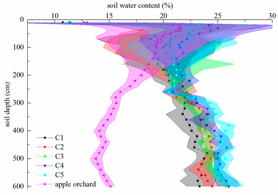 In general, in the 0–600cm soil layer, the mean SWS under apple orchard is 105.05 mm, the highest mean SWS under cropland is 181.58 mm, and it appears at C2. The lowest mean SWS under cropland is 170.86 mm, and it appears at C3. In the site of C4 and C5, the mean SWS increases gradually with the increasing soil moisture monitoring distance from orchard, and it is 176.21 mm at C5.