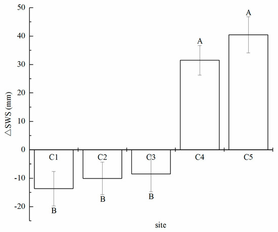 In deep soil layer, the mean SWS also presents a significant difference among all of the sites. There is a downward trend of the mean SWS with the increasing distance from the apple orchard in the 400–600 cm soil layer except C5. In the cropland, the mean SWS of C1, C2, C3, C4, and C5 is 32%, 30%, 19%, 13%, and 17% higher than that in apple orchard (p < 0.05). In this soil layer, the lowest SWS appears at C4, which is 61.12 mm.
