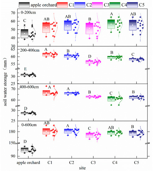 Variations in soil water storage during the growing season in 2014 of each site. A distribution curve is on the right side of each box plot and data points are represented by spheres. Different letters indicate significant differences (p < 0.05).