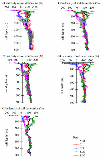 Figure 9 shows the intensity of soil desiccation at each monitoring site in the cropland. It can be clearly seen that there is soil desiccation in the 0–20 cm layer. Soil desiccation is present at the soil moisture monitoring sites C1, C2, and C3, adjacent to the orchard, with the phenomenon mainly occurring in July and August. At C1, soil desiccation is present in the 20–160 cm soil layer, with a desiccation index of 0%–50%. This level is considered to be moderate desiccation. At C2 and C3, soil desiccation is present in the 20–140 cm soil layer, with a desiccation index of 0%–25%. This level is considered to be mild desiccation. In addition, with increasing soil depth, the desiccation index gradually decreases, and there is no soil desiccation below 160 cm. At C4 and C5, there is no soil desiccation, except in the 0–20 cm soil layer. Also, the desiccation index of the deep soil (300–600 cm) is stable, at between −100% and −150%.