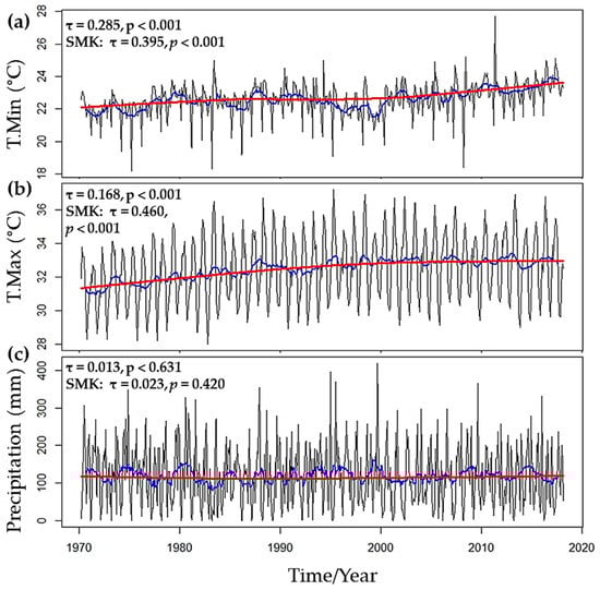 Monthly trend analysis of minimum and maximum temperature (a,b) in °C and precipitation in mm (c) at the Sefwi Bekwai weather station. Data was obtained from the Ghana Meteorological Agency (Kumasi, Ashanti Region, Ghana). Test for overall trend in data is shown by the red line with statistical test results indicated by Kendal’s Tau (τ) and a resultant p-value. Tests for seasonality in data is indicated in blue and results shown with the Seasonal Mann-Kendall test (SMK). The “Kendall” package in R statistical software was used for the analysis.