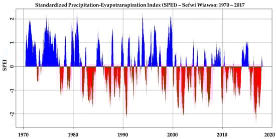 Time series of Standardized Precipitation-Evapotranspiration Index—SPEI values for Sefwi Wiawso (55 miles from study site): 1970–2017. Areas in blue indicate periods of no drought and red depicts periods of drought and corresponding SPEI values.