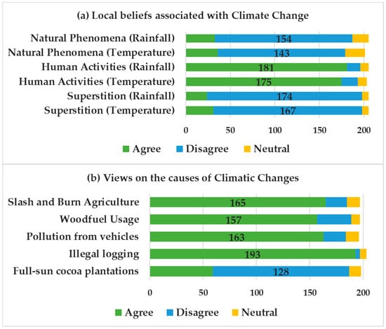 Descriptive examination of survey responses indicated that farmers believe that climatic changes are mostly as a result of human activities; precipitation (181: 88%) and temperature (175: 86%). This finding is consistent with farmers’ belief that climatic changes are not just isolated climatic anomalies. Farmers mostly disagreed that both precipitation (71%) and temperature (75%) were climatic anomalies. Superstitious (curses/spells) association with climatic changes were mostly dispelled by respondents with respect to changes in precipitation (85%) and temperature (81%). On the possible human attributable causes of climatic changes, illegal logging (95%) was the most highlighted. Slash and burn agricultural practice in the area (84%) as well as pollution from vehicles (83%) were similarly pointed out as detrimental to the environment. According to 80% of respondents, widespread woodfuel harvesting could also contribute to climate change. Despite previous research on the potentially harmful environmental impacts of implementing full-sun cocoa systems (cocoa monocultures), the majority of farmers (65%) believed such systems do not contribute to climatic changes, as opposed to 30% who perceive a change to full-sun cocoa systems, a plausible climate change driver (Figure 4).