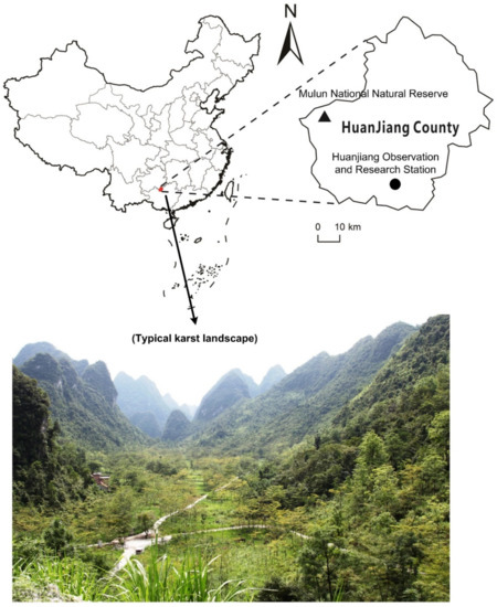 Sketch map showing the Huanjiang Observation and Research Station (●) and Mulun National Natural Reserve (▲) and the typical landscape in a karst ecosystem of southwest China.