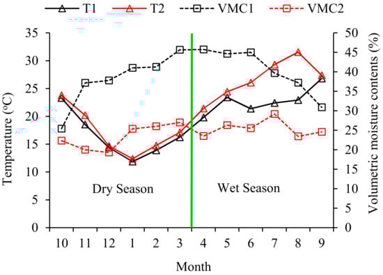 Soil temperature (T) and volumetric moisture contents (VMC) at 10 cm depth in Huanjiang Observation and Research Station (T1 and VMC1) and Mulun National Natural Reserve (T2 and VMC2) from 2008 to 2015.