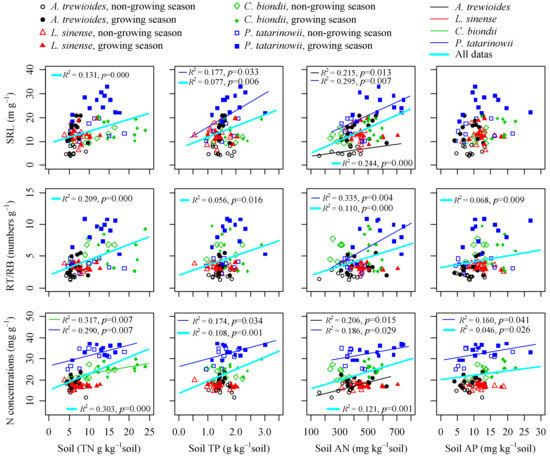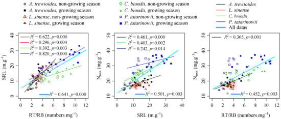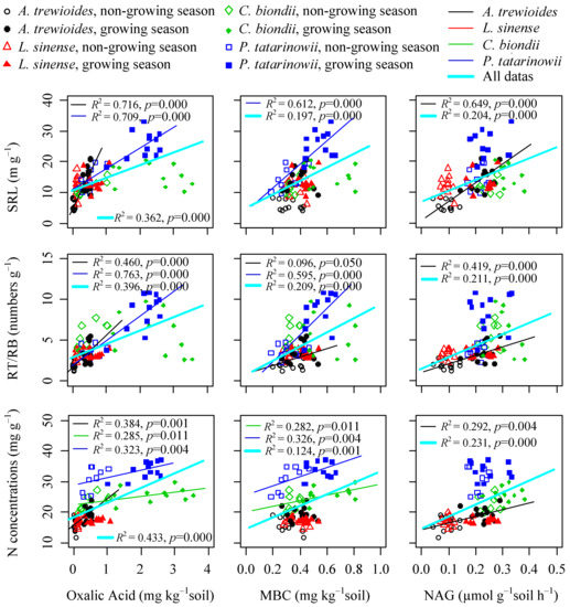 Data treatments and calculations were performed using R x64 3.2.2 statistical software [56]. The homogeneity of variance was tested prior to the statistical analyses. The mixed model (lme4 package in R) was used to compare the TN, TP, AN, and AP in rhizosphere and bulk soils (Table 1) and the SRL, RT/RB, and Nroot in fine roots among four study plant species (Table 2 and Table 3) in both seasons [47]. The probability of significance was defined as p < 0.05. We then built linear regression models to quantify the relationships among SRL, RT/RB, and Nroot in fine roots of the four study plant species and presented them as scatter plots (Figure 3). Linear regression models were then used to evaluate the relationships of three fine root traits to rhizosphere soil parameters (TN, TP, AN, and AP), oxalic acid, MBC, and NAG (Figure 4 and Figure 5).