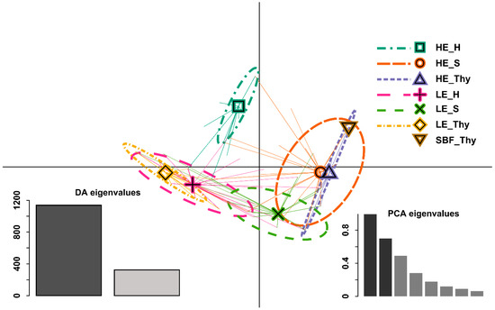 Discriminant analysis of principal component (DAPC) [65] on multivariate phenotypic data. Data points are displayed along the first and second discriminate axes (x- and y-axes, respectively) of the DAPC indicated by the stars originating from the corresponding distribution centre. Groups are depicted by 95% inertia ellipses with corresponding barycentre as a symbol. LE: Low elevation type; HE: High elevation type; SBF: relict stand “Schlossbergfichte”; S: Ore Mountains (Saxony); Thy: Thuringia; H: Harz Mountains. Note that for the stand SBF_Thy, no ellipse is displayed as all data points are identical. In the bottom left corner, the DA (discriminate analysis) eigenvalues are displayed, where the first and second DA are highlighted in dark grey and grey, respectively. The PCA (principal component analysis) eigenvalues are displayed in the lower right corner, where the retained PC’s (principal component) eigenvalues are highlighted in dark grey.