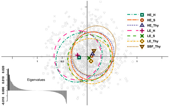 Spatial principal component analysis [66] based on the allele data, reflecting low spatial genetic differentiation for the SSR loci. Data points (grey) are displayed on the first and second principal components (x- and y-axes, respectively), where the symbols represent the different stands in the upper right legend. LE: Low elevation type; HE: High elevation type; SBF: relict stand “Schlossbergfichte”; S: Ore Mountains (Saxony); Thy: Thuringia; H: Harz Mountains. Groups are depicted by 95% inertia ellipses with a corresponding barycentre as a symbol. In the bottom left corner, the eigenvalues are displayed, were the first and second eigenvalues are displayed with wider bars and highlights in the darker grey.