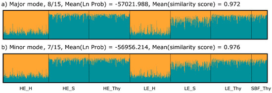 Clustering result based on the STRUCTURE analysis [96] and displayed as the average over the 15 runs obtained from CLUMPAK [100]. In the major mode, (a) eight of the 15 runs were summarized and an additional minor mode (b) of seven runs was obtained. The average logarithmic probability of the data for the given mode and the average similarity of the runs summarized is also given.