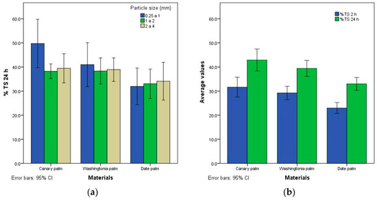| Material | Particle (mm) | Thickness (mm) | Density (kg/m3) | TS 2 h (%) | TS 24 h (%) | WA 2 h (%) | WA 24 h (%) |