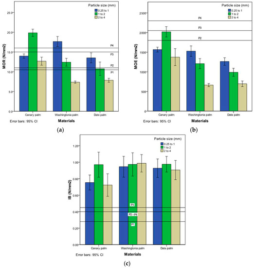 | Material | Particle (mm) | MOR (N/mm2) | MOE (N/mm2) | IB (N/mm2) |