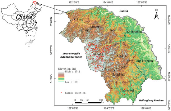 Our study area was located in the Great Xing’an Mountains in China, which is a typical southern boreal forest area with elevations varying from 139 to 1511 m (121°12′–127°00′ E, 50°10′–53°33′ N) (Figure 1). This area has a cold temperate continental monsoon climate with average annual temperature varying from 1 °C at its southern extremes to −6 °C at its northern extremes, and precipitation varying from 442 mm in the south to 240 mm in the north. More than 60% of the annual precipitation falls in the summer season from June to August [26]. The slope of our study area is relatively gentle, with 80% of the area less than 15°. Most of the landscape is mainly dominated by cool temperate coniferous forests. The main boreal conifer tree species is Dahurian larch (Larix gmelinii (Rupr.) Kuzen, hereafter “larch”), which are usually found in cool moist sites. The broadleaf tree species mainly include white birch (Betula platyphylla Suk.) and aspen (Populus davidiana Dode), and occupy drier, well-drained sites of the area [27]. Other tree species, such as Korean spruce (Picea koraiensis Nakai, hereafter “spruce”), Asian black birch (Betula davurica Pall., hereafter “black birch”), Mongolian Scots pine (Pinus sylvestris var. mongolica Litv., hereafter “pine”), willow (Chosenia arbutifolia (Pall.) A. Skv.), Mongolian oak (Quercus mongolica Fisch. ex Ledeb.), and a shrub species (Pinus pumila (Pall.) Regel), are interspersed with larch forests and have a small area of distribution [28]. Black birch and Mongolian oak were mainly distributed in the southern part of the study area, whereas pine was distributed in the northern part. Young and middle-aged forests comprised the main part of the forest landscapes, with the exception of the conservation area due to long-term logging and fire disturbance. The forest structures varied due to frequent disturbance and large spatial variation in climate and terrain.