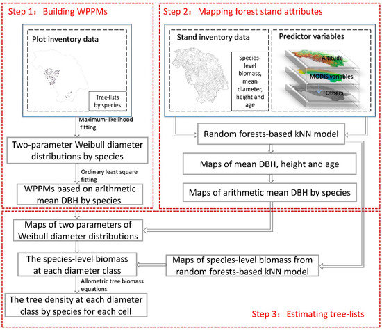 The approach in this study included the following steps (Figure 2): (1) We built the Weibull parameter prediction models (WPPMs) using plot inventory data for estimating diameter distributions in each pixel; (2) We used kNN models to map forest stand attributes (e.g., species-level biomass, stand age, height, DBH) and provided the independent variables for WPPMs in each pixel; (3) We estimated tree-lists by species in each pixel by combining Weibull diameter distributions estimated by WPPMs and forest stand attributes imputed by the kNN method.