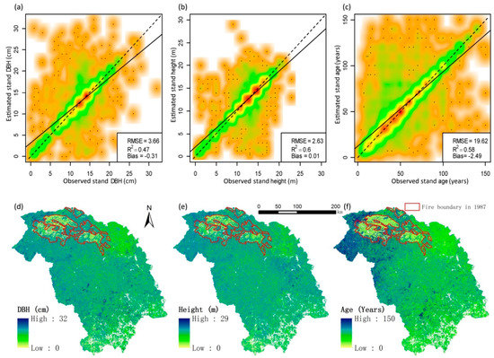 Goodness-of-fittings (density scatterplots) of the random forest (RF)-based kNN models of stand DBH, height, and age (a–c) and maps of estimated diameter, height, and age (d–f). The points superimposed on the density image are the points from those areas of lowest regional densities, which are the identification of outliers. The dotted line is the 1:1 line and the dashed line is the geometric mean functional regression line.