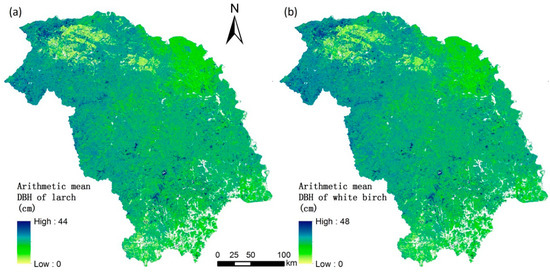 Maps of arithmetic mean DBH of larch (a) and white birch (b) based on Equations (4) and (5).