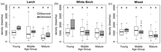 Boxplots of observed vs. predicted tree density of three main forest types (Larch forests (a), White birch forests (b) and Mixed forests (c)) with similar environment (p > 0.05). Observed tree density was calculated from the inventory plot data in 2011. Estimated tree density was calculated from the estimated tree-lists in 2000s. The same letter “a” indicated that there was no obvious difference between observed and estimated tree density.