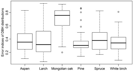 where is the observed stem number of class i by species, is the estimated stem number of class i by species based on WPPMs, is the total observed stem number by species, and is the total estimated stem number by species. The error index ranges from 0 to 1, with 0 meaning a perfect fit and 1 meaning that the distributions do not overlap at all [38].