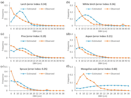 DBH distributions by species (larch (a), white birch (b), pine (c), aspen (d), spruce (e), Mongolian oak (f)) of the observed vs. estimated wall-to-wall tree-lists based on the transformed inventory tree-lists data. The error indices were calculated by regarding all transformed plots as a whole.