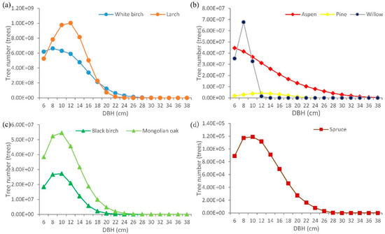 Estimated tree-lists of the study area in 2000 by species (larch and white birch (a); aspen, pine and willow (b); black birch and Mongolian oak (c); spruce (d)).