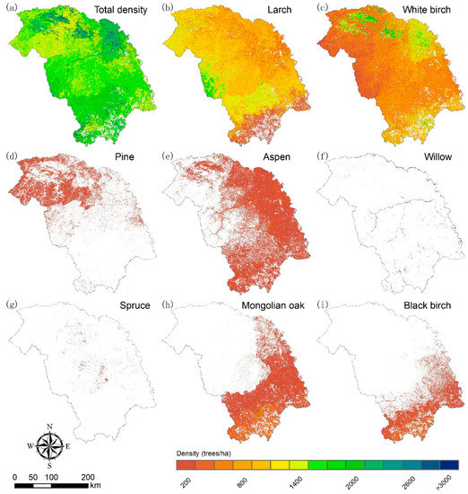 Maps of estimated total stand density and stand density by species (total density (a), larch (b), white birch (c), pine (d), aspen (e), willow (f), spruce (g), Mongolian oak (h) and black birch (i)).