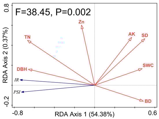 Forward selection of the seven significant environmental factors in the RDA ordinations showed that the occurrence of C. kunyushanica was primarily influenced by total N, DBH, soil water content, bulk density, available K, Zn2+, and stem density, and their total contribution to C. kunyushanica occurrence was 89.4% (Table 6). The RDA ordination biplot revealed specific associations between the occurrence of C. kunyushanica and environmental factors; DBH, total N, and Zn2+ were positively associated with IR and PSI, whereas available K, stem density, soil water content, and soil bulk density had a negative association with IR and PSI (Figure 1).