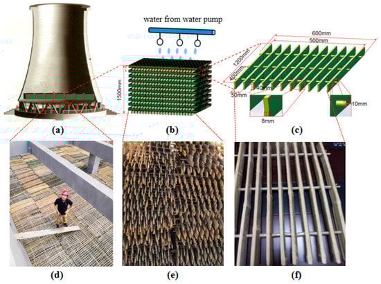Hyperbolic cooling towers are widely installed at power plants, steel mills, petroleum refineries, and petrochemical plants due to their high capacity for heat rejection and energy saving. Compared to package-type cooling towers, hyperbolic cooling towers are generally much larger in size and require much more cooling packing. Cooling packing is the core component of cooling towers, and is responsible for 60%–70% of the heat dissipation in the cooling tower [,,,]. The type of packing material has an important role, as it provides a large surface area for evaporative heat and mass transfer from hot water to the ambient air and increases the contact time between both the two []. Different materials such as polyvinyl chloride (PVC), cement, and glass fiber reinforced plastic have been used as cooling packing. Currently the most popular cooling packing is made of PVC, with a market share exceeding 70% in China []. However, the PVC packing industry is facing major challenges, such as diminishing availability of petrochemical resources, increases in their prices, and the residues of PVC in the environment beyond its functional life []. In China, there are many power plants, steel mills, petroleum refineries, and petrochemical plants, from which the discarded cooling packing could cause severe environmental pollution. Furthermore, PVC packing has a short service life and poor anti-fouling properties. Thus, researchers and entrepreneurs have been seeking environmentally-friendly and longer-serving alternatives to PVC.