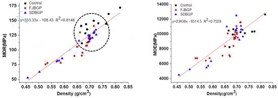Relationships between MOR/MOE and density. Details of the dotted circles are explained in the text. FJBGP: bamboo grid packing collected from Fujian; SDBGP: bamboo grid packing collected from Shandong.