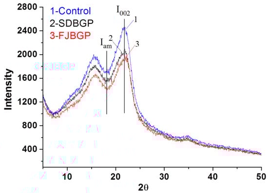 The XRD patterns of the three groups of samples are shown in Figure 3. It is clear that there was no change in the position of the cellulose diffraction peak. However, after BGP had been used in the cooling tower for nine years, the intensity of cellulose diffraction peak (002) significantly dropped. The crystallinity and crystal size of samples are as shown in Table 2. Compared to the control samples, the crystallinity retention of FJBGP and SDBGP were respectively 87.76% and 89.77%, and the crystal size retention of FJBGP and SDBGP were 85.21% and 86.88%. Hot water in the cooling tower could degrade the amorphous matrix of the used BGPs, which may increase the CrI. However, in this study, the crystallinity of FHBGP and SDBGP decreased. This could be explained by the following reasons: The hot water cleaved acetyl groups from hemicellulose side chains to yield acetic and uronic acid [], which catalyzed the hydrolysis of cellulose. Acid degraded not only the amorphous region of cellulose, but also the crystalline region [], which is consistent with the decrease in crystal size (Table 2). The proportion of the crystalline region in the cell walls was low. When acid cleaved the molecular chain in the crystalline region, part of the crystalline region would be turned into an amorphous region, resulting in lower crystallinity and smaller crystal size of SDBGP and FJBGP.