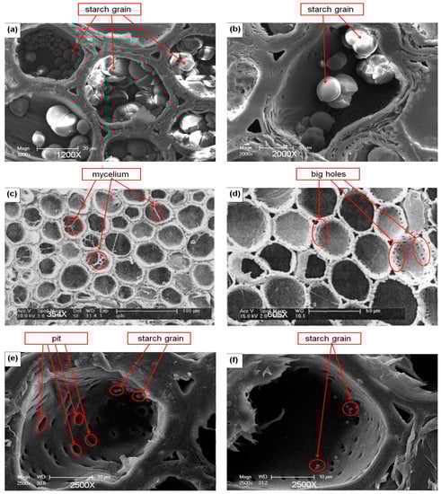 As shown in Figure 4a,b, the parenchyma cells of the control specimens contained many starch granules—several cells were virtually full of it. Furthermore, the starch granules were big. The inner walls of the cells were smooth. After being subjected to a rotting test for three weeks and 15 weeks, respectively, starch granules in the parenchyma cells disappeared and had been completely digested by rot fungi (Figure 4c,d) []. There were a large number of mycelia in the cell cavities, and the inner walls of the cells have formed big holes due to erosion by rot fungi. Noticeably, the following phenomena were observed in this study of both SDBGP and FJBGP: In the parenchyma cells of used BGPs, large-size starch granules disappeared (Figure 4e,f), but a few small-sized granules were still present. The inner walls of all cells remained smooth, without mycelium. The holes observed in the inner walls of cells were not the result of erosion by rot fungi, but were pits. These phenomena indicated that the BGPs were not attacked by fungi after being used for nine years, which could be explained by the following reasons: Firstly, the surfaces of the bamboo strips were covered with a 0.1–0.5 mm thick water film due to the continuous presence of water flow in the cooling tower []. Bamboo decay fungi are mostly aerobic fungi. The water film prevented them from obtaining oxygen. Secondly, the water temperature in the cooling towers generally exceeded 40 °C, which is higher than the suitable temperature for fungal growth (3~38 °C) []. Moreover, the starch granules in the bamboo were partially dissolved by the circulating hot water, resulting in the decreased amount and size.