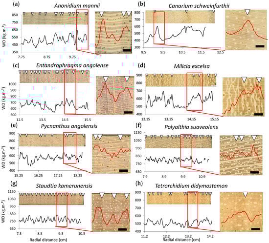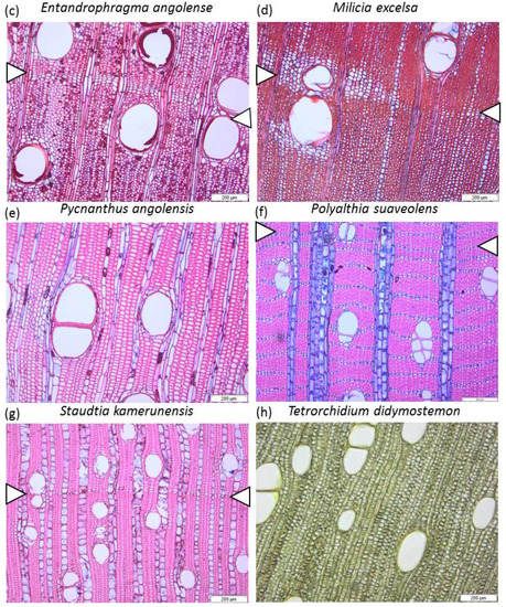 - Fichtler, E.; Worbes, M. Wood anatomical variables in tropical trees and their relation to site conditions and individual tree morphology. IAWA J. 2012, 33, 119–140. [Google Scholar] [CrossRef]