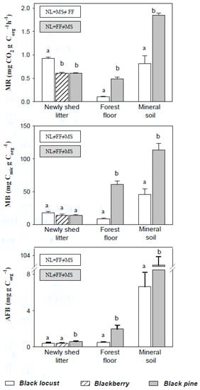 The three types of NL did not differ for microbial biomass, whereas active fungal biomass was significantly higher (p = 0.005) in black pine litter than in that of black locust and blackberry. Forest floor and mineral soil had significantly higher MB (p < 0.01) and AFB (p < 0.001) in the pine stand than in the black locust stand (Figure 1).
