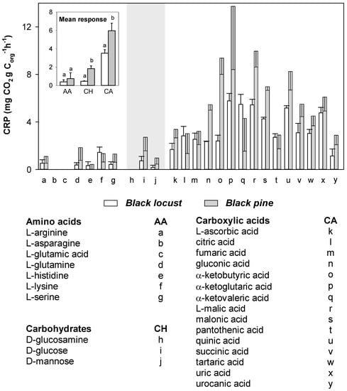 Catabolic Response Profile (CPR) of mineral soil from a black locust and a black pine stand. CRP was measured in soil samples (0–5 cm depth) amended with 25 low-molecular simple organic substrates in the paired stands (see legend). The mean response for type of substrate (AA: amino acids; CH: carbohydrates; CA: carboxylic acids) is shown in the inner panel. Different lowercase letters indicate statistically significant differences (t-test, p < 0.05) between stands.