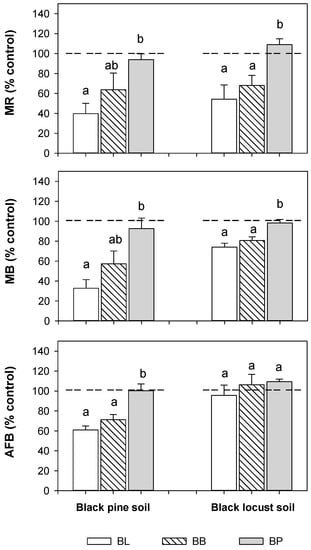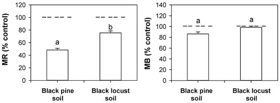 Water extracts of black locust forest floor reduced MR in soil samples from the pine stand as well as in those from the black locust stand (Figure 4). However, in pine soil, MR was reduced more than in black locust soil (p < 0.05).