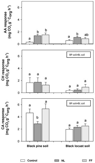The amendment of black pine and black locust soil with litter extracts from black locust, both newly-shed and forest-floor litters, altered the CRP pattern, i.e., the range and relative expression of microbial activities involved in the decomposition process of organic matter components. Changes induced by the amendment with extracts from newly-shed black locust litter mainly included an increase in both soils in the response to amino acids, likely due to the priming effect []. Indeed, the increased mineralization of amino acids likely reflects the increased microbial N-demand to synthesize enzymes required to decompose the additional C sources supplied to the soil with the litter extracts.