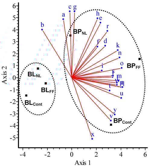PCA performed on CRP of black locust and black pine soils (Figure 6) showed a clear separation between the two soils, viz. that of black pine and that of black locust (Axis 1) as well as between control soils and soils amended with litter extracts (Axis 2). Three substrates, i.e., ketoglutaric acid (p), succinic acid (v), and malonic acid (s) explained 41%, 13%, and 6%, respectively, (altogether 60%) of the total variance.