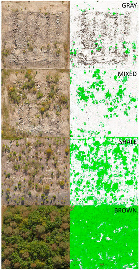 Example of canopy cover estimation method from each spoil type. The number of green pixels, representing tree canopy, was divided by the total number of pixels in the image to determine the percent cover (GRAY = Gray sandstone, MIXED = mixed sandstones and shale, SHALE = shale, BROWN = brown sandstone).
