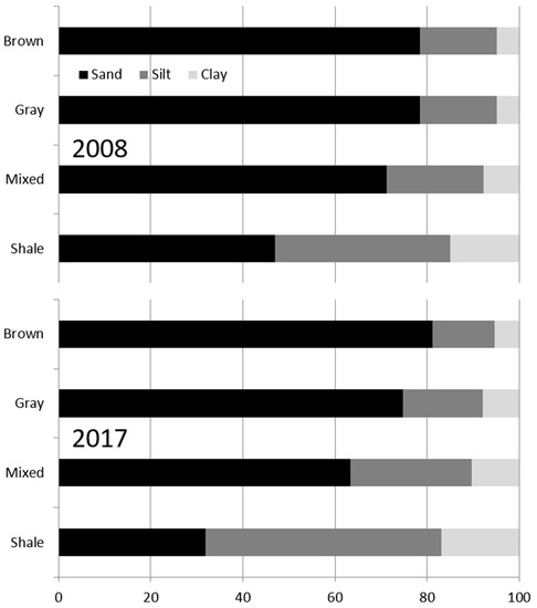 Shifts in soil particle size distribution across spoil types from 2008 to 2017 (2008 data from Miller et al. [12]).