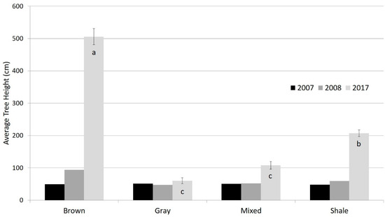 Average tree height (cm) across time (2007, 2008, 2017) and spoil type (brown sandstone, gray sandstone, mixed spoils, and shale). Error bars represent ± SE. Means with different letters are significantly different (p < 0.05). Data from 2007–2008 from Miller et al. [12].