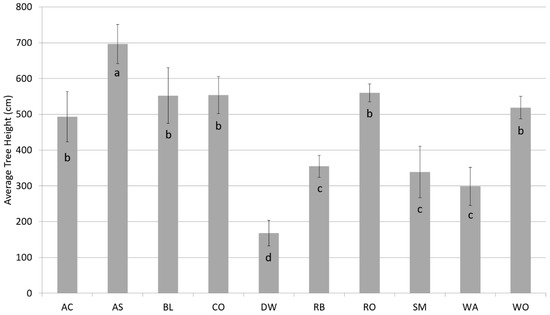 Average tree height (cm) for each species across brown sandstone plots only. Error bars represent ± SE. Means with different letters are significantly different (p < 0.05). AC = American chestnut, AS = American sycamore, BL = black locust, CO = chestnut oak, DW = dogwood, RB = redbud, RO = northern red oak, SM = sugar maple, WA = white ash, WO = white oak.