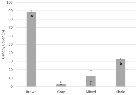 Canopy cover (%) was highest on Brown, followed by Shale, Mixed, and Gray. Bars with similar letters are not significantly different from one another (p > 0.05).