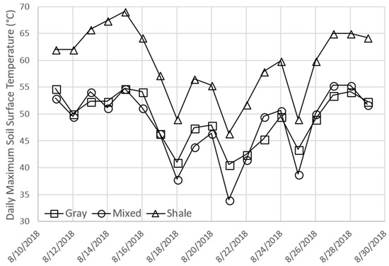 Daily maximum soil surface temperature, plotted for Gray, Mixed, and Shale (No data were available for Brown due to logger damage).
